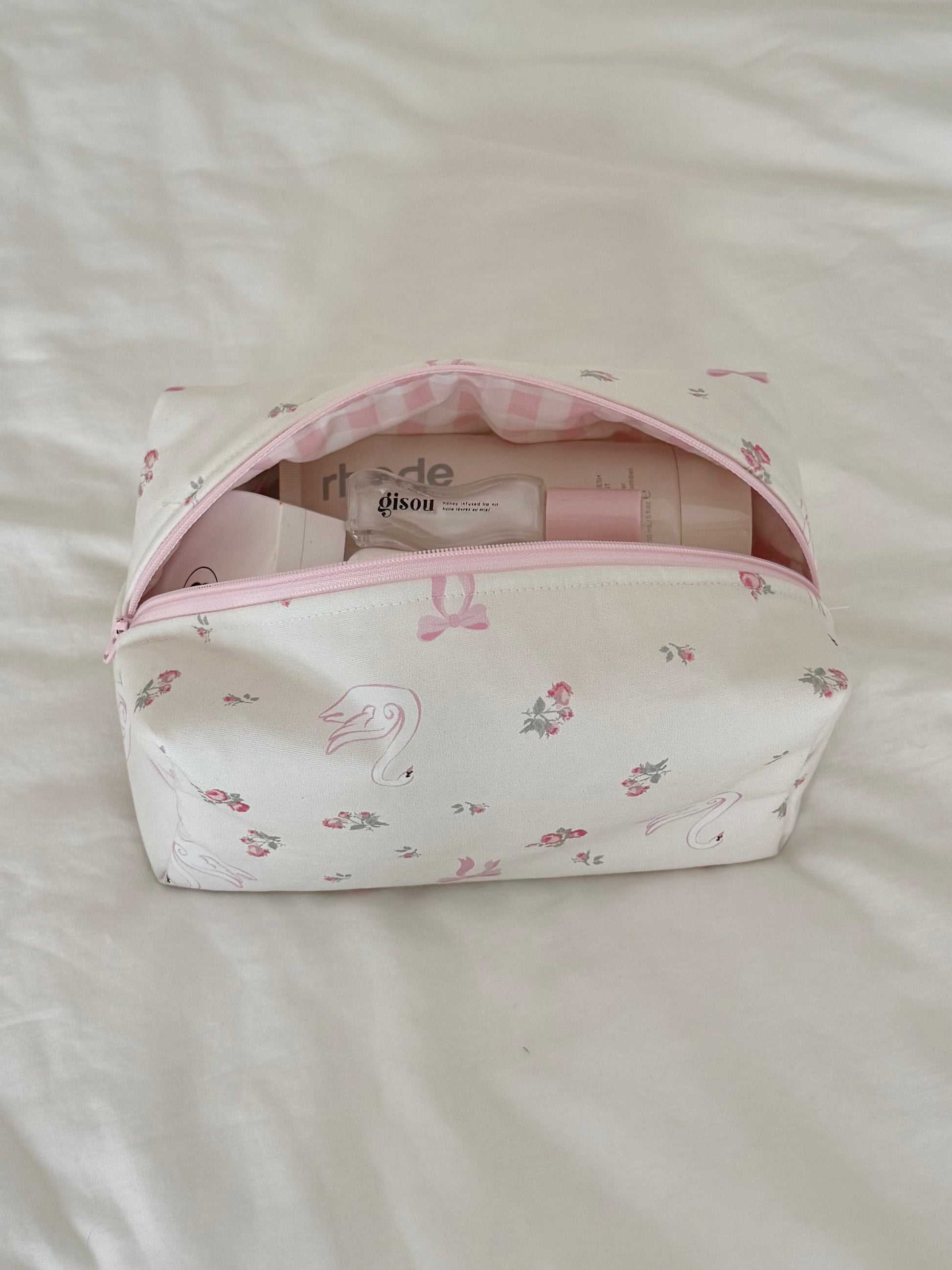 Bring a touch of serenity to your daily routine with the Swan Canvas Pouch in soft pink. The delicate swan motif adds elegance, and each pouch features a unique, non-fixed design, making every piece one-of-a-kind.